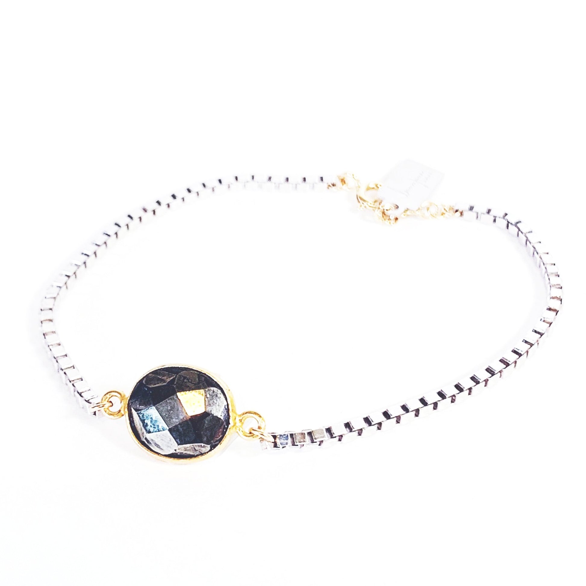 Rhodium (silver type of color) box chain bracelet with pyrite circle pendant. Stone shape and coloring may vary as cuts of stones are unique.
